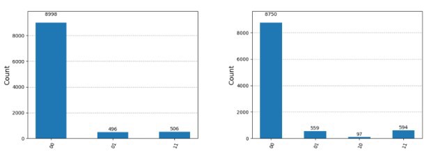 Зураг 5-д үзүүлсэн квант төхөөрөмжийн үр дүн нь онолын таамаглалтай бага зэрэг зөрж байгаа нь өнөөгийн квант тооцооллын төгс биш, дутагдалтай талтай холбоотой. Бидний гэрлэсэн хосуудын зүйрлэлээр бол, Bob заримдаа Alice-аас урт насалж байна (|10⟩ = 0.0097). Энэ нь онолын нөхцөлд гарч ирдэггүй үр дүн юм.