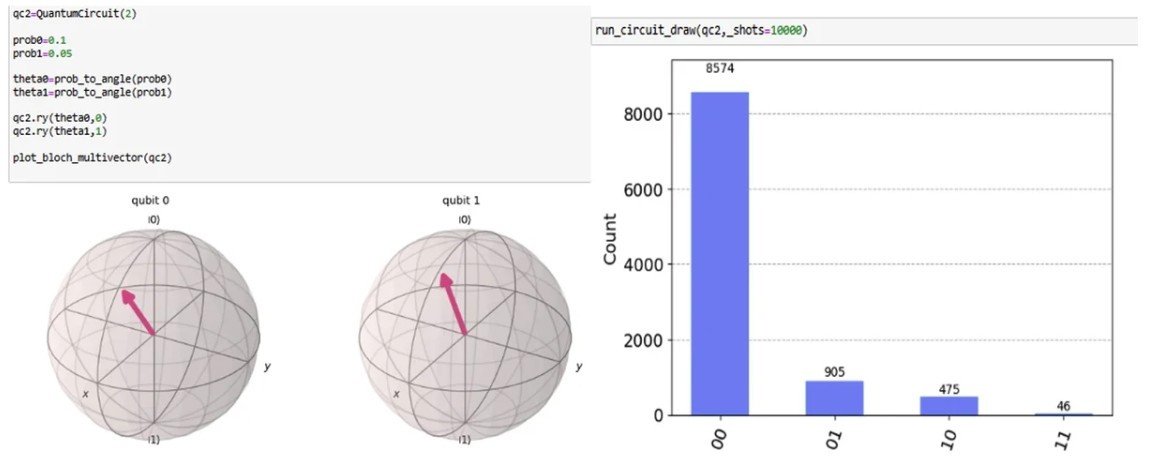Bloch бөмбөрцгүүд (Зураг 1) нь квант битийн төлөвийг геометрээр дүрслэн харуулах боломжийг олгодог. Ямар ч квант төлөвийг энэ бөмбөрцгийн гадаргуу дээрх нэг цэгээр илэрхийлж болох бөгөөд хоёр өнцгөөр (θ ба φ) тодорхойлно. Энэ нь газрын уртраг, өргөргийг зааж буйтай адил юм. Эдгээр өнцгүүдийг тохируулснаар (sin(θ/2) = √p), магадлалуудыг (q50) шууд квант төлөвт кодлох боломжтой. Энэ нь зүгээр нэг “зооc хаях” жишээнээс хэтэрч, хоёр туйлын оронд бүхэл бүтэн бөмбөрцгийн боломжийг ашиглаж байна гэсэн үг юм. Үүнийг бид Python хэл дээр Qiskit багцыг ашиглан хялбархан хэрэгжүүлж чадна (Зураг 2).